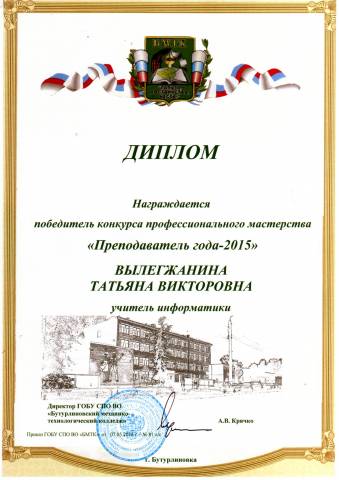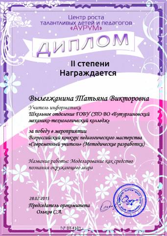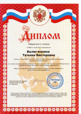 Результатом моего профессионального роста и мастерства является обобщение опыта через открытые уроки. В 2011 г. провела открытый урок информатики и ИКТ в 11 классе по теме «Знакомство с инструментальной средой Delphi». В рамках фестиваля открытых уроков-2012 мой урок был отмечен дипломом в номинации «За внедрение информационных технологий». В 2014 г. делилась опытом по внедрению информационно-коммуникационных технологий в учебный процесс 8 класса по теме «Моделирование как средство познания окружающего мира».