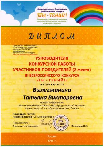 В этом же году Сердюкова Юлия и Съянова Марина приняли участие и заняли второе место во Всероссийском конкурсе «Ты – гений!» с проектом «Олимпийский парк».