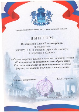 2. Диплом победителя региональных научно-технических чтений "Современное профессиональное образование Костромской области: инновационные методы, формы, технологии обучения и воспитания"