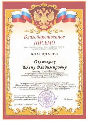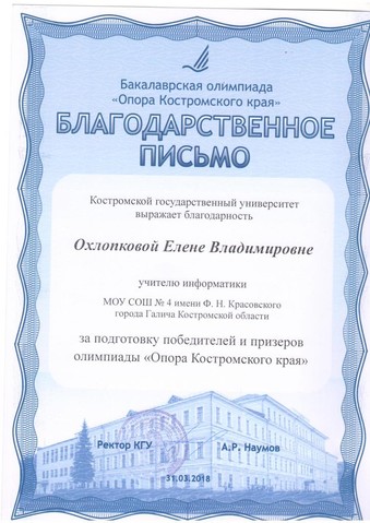 4.Благодарственное письмо Костромского государственного университета за подготовку победителей и призеров олимпиады "Опора Костромского края"