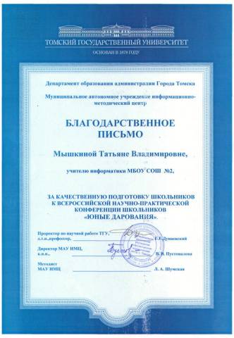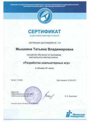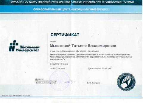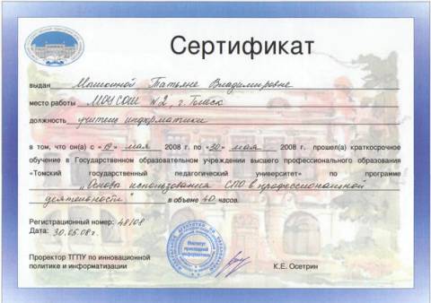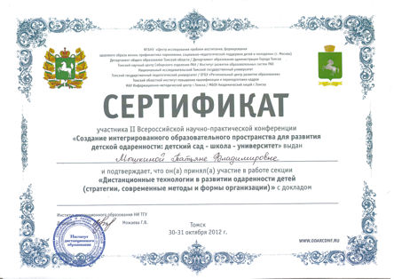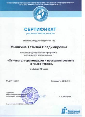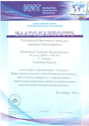 - Благодарственные письма за активное участие в совместной реализации проектов ИКТ(Образовательный центр «Школьный университет»12.05.2011, 27.06.2012 - Благодарственное письмо(За качественную подготовку школьников к Всероссийской научно-практической конференции школьников «ЮНЫЕ ДАРОВАНИЯ», Департамент образования, 2012г.) - Благодарность за организацию конкурса КИТ (Российский Оргкомитет конкурса, 26.11.2011) - Почетная Грамота по итогам экспертизы официальных сайтов ОУ в 2008-2009 учебном году - Сертификат №48108, 30.05.08, 40 часов, ТГПУ «Основы использования СПО в профессиональной деятельности». - Сертификат №03/К-10/2056, 28.08.2010, 48 часов, Образовательный центр «Школьный университет»: «Компьютерная графика и анимация в 8-11классах». - Сертификат участника мастер-класс, № ДС-11/0395, 22.09.2011, 24 часа, Образовательный центр «Школьный университет»: «Разработка компьютерных игр» - Сертификат участника мастер-класс, № ДМК-12/0013, 23.02.2012, 24 часа, Образовательный центр «Школьный университет»: «Основы алгоритмизации и программирование на языке Pascal». - Сертификат за участие во Всероссийском конкурсе «КИТ» как участник и организатор, 21 ноября 2011г. - Сертификат за участие в партийном проекте «СТАРШЕЕ ПОКОЛЕНИЕ»в качестве преподавателя курса основ компьютерной грамотности, 2011г. - Сертификат участника II Всероссийской научно-практической конференции «Создание интегрированного образовательного пространства для развития детской одаренности: детский сад – школа –университет», 2012 г. Самообразование