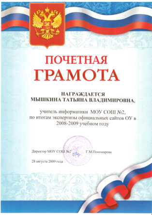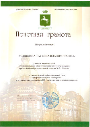 - Почетная грамота за многолетний доблестный труд -Приказ от 05.11.2009 №190-II (Департамент образования, г. Томск)