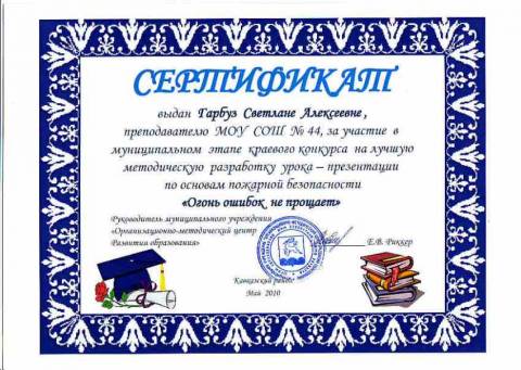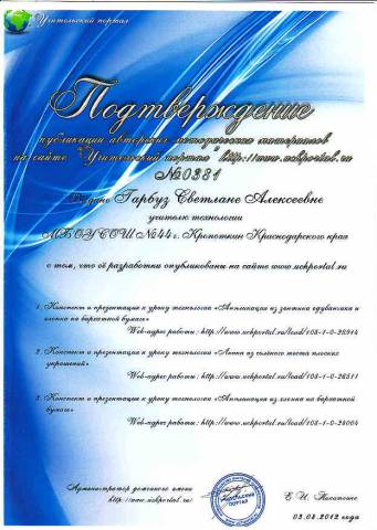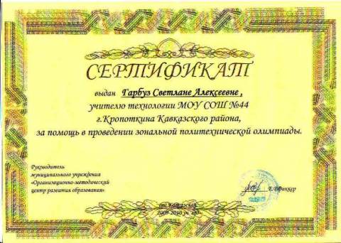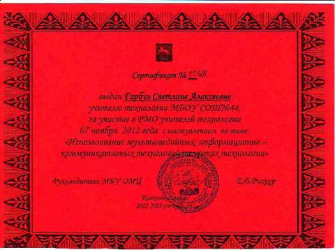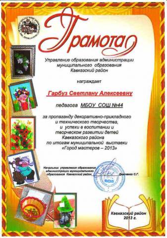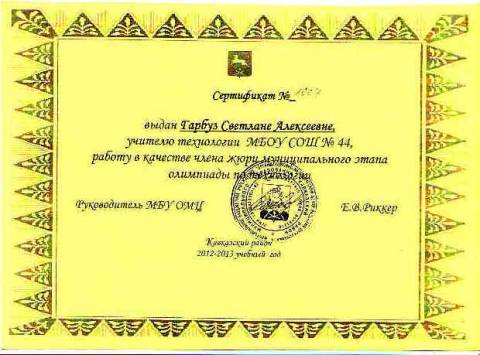 2. Грамота МБОУ СОШ № 44 за активное участие и творческий подход, за верность и любовь к родной школе в проведении и подготовке массового мероприятия, посвященного 100- летнему юбилею школы, выданная 20.10.2012 года. 3. Сертификат № 1007 за работу в качестве члена жюри муниципального этапа олимпиады по технологии, выданный МБУОМЦ, Кавказский район 2012 – 2013 учебный год. 4. Сертификат № 1038 за участие в РМО учителей технологии 07 ноября 2012 года с выступлением по теме: «Использование мультимедийных информационно – коммуникативных технологий на уроках технологии», выданный МБУ ОМЦ, Кавказский район 2012 – 2013 учебный год. 5. Сертификат за участие в муниципальном этапе краевого конкурса на лучшую методическую разработку урока – презентации по основам пожарной безопасности «Огонь ошибок не прощает», выданный МБУОМЦ, Кавказский район, май 2010. 6. Сертификат за помощь в проведении зональной политехнической олимпиады, выданный МБУ ОМЦ, Кавказский район 2009 – 2010 уч. год. 7. Сертификат о том, что прошла краткосрочное повышение квалификации по программе: "Методические особенности преподавания технологии по УМК "Технология. Метод проектов. Под редакцией И. С. Сасовой"ООО Издательского центра "ВЕНТАНА - ГРАФ",2009. 8. Грамота Управления образования администрации муниципального образования Кавказский район за пропаганду декоративно - прикладного и технического творчества, и успехи в воспитании и творческом развитии детей Кавказского района по итогам муниципальной выставки "Город мастеров - 2013". 9. Подтвержение публикации авторских методических материалов на сайте "Учительский портал", 2012 г. Самообразование