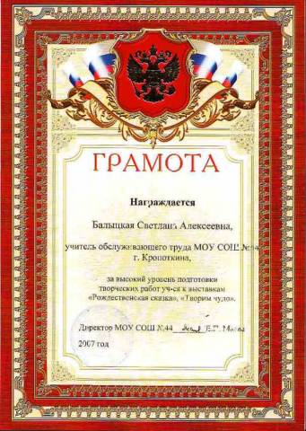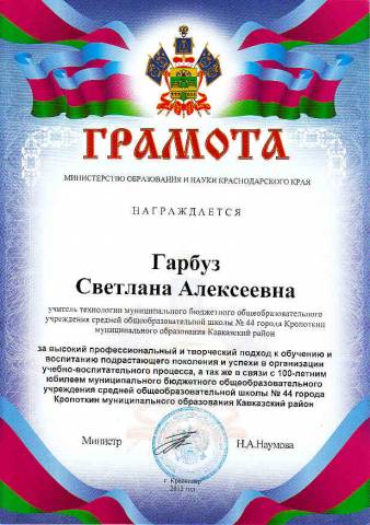 1. Грамота за высокий профессиональный и творческий подход к обучению и воспитанию подрастающего поколения и успехи в организации учебно – воспитательного процесса, а так же в связи с 100 – летним юбилеем муниципального бюджетного общеобразовательного учреждения средней общеобразовательной школы № 44 города Кропоткин муниципального образования Кавказский район, выданная Министерством образования и науки Краснодарского края в 2012 году.