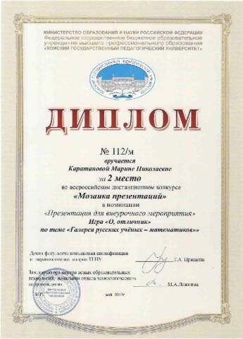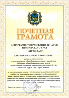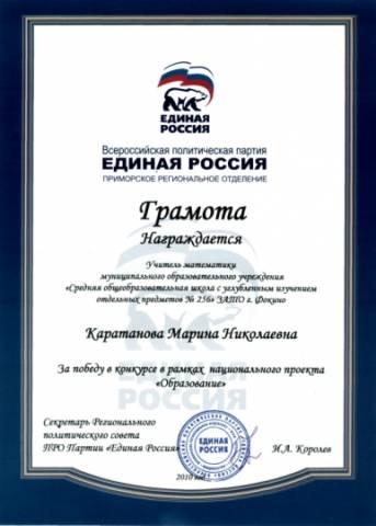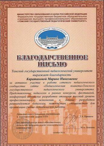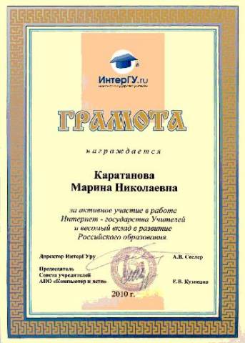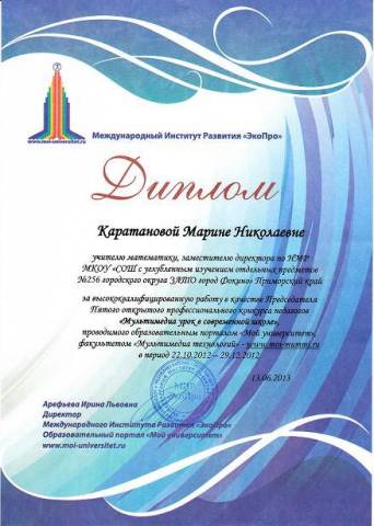 Я, КАРАТАНОВА Марина Николаевна, учитель математики высшей квалификационной категории, заместитель директора по методической работе муниципального казённого общеобразовательного учреждения «Средняя общеобразовательная школа с углубленным изучением отдельных предметов №256 городского округа ЗАТО города Фокино», работаю в данной школе около 20 лет, имею стаж педагогической работы 25 лет. Образование высшее, в 1983 году окончила Горьковский государственный педагогический институт по специальности учитель физики и астрономии.