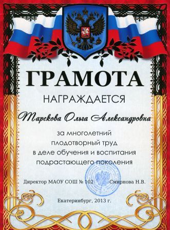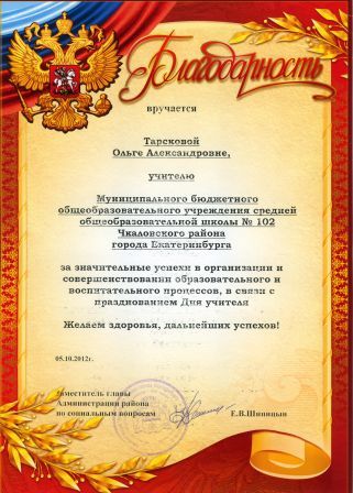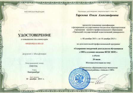 - "Содержание внеурочной деятельности обучающихся с ОВЗ в условиях введения ФГОС НОО" (24 часа) УГПУ, (08.12.15 - 10.12.15г.) Удостоверение 662402113513, рег.№2102/15А