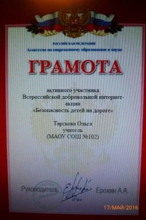 В МАОУ СОШ №102 с 2012 года веду работу по предупреждению и профилактике детского дорожно-транспортного травматизма. Ежегодно учащиеся отряда ЮИД принимают участие в районных и городских конкурсах и акциях: «Безопасное колесо», «Пешеход на переход», «Юный водитель», конкурсах и выступлениях агитбригад по безопасности дорожного движения, Всероссийской интернет-акции «Безопасность детей на дорогах», «Стань заметней на дороге», получают грамоты и благодарности.