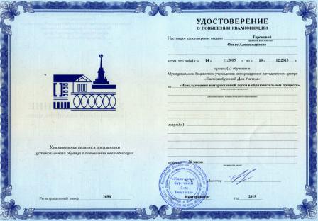 - "Использование интерактивной доски в образовательном процессе"(36 час.) ЕДУ, (14.11.15 - 19.12.15), рег.№1696