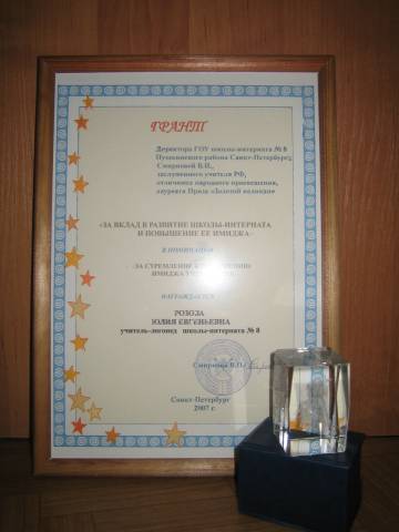 - Удостоена Гранта директора ГОУ школы-интерната №8 Пушкинского района Санкт-Петербурга заслуженного учителя РФ, отличника народного просвещения, лауреата Приза «Золотой пеликан» В.П.Смирновой «За стремление к повышению имиджа учреждения» в номинации «За инновационную деятельность и творчество» (2011г.)