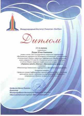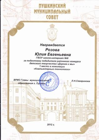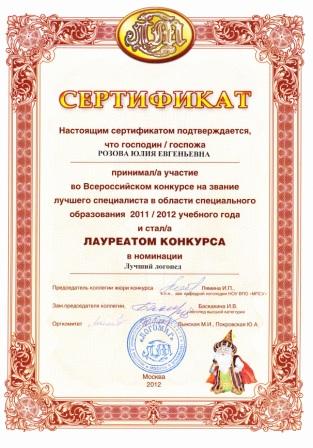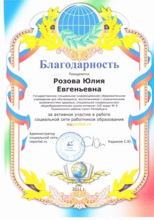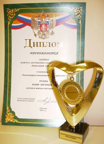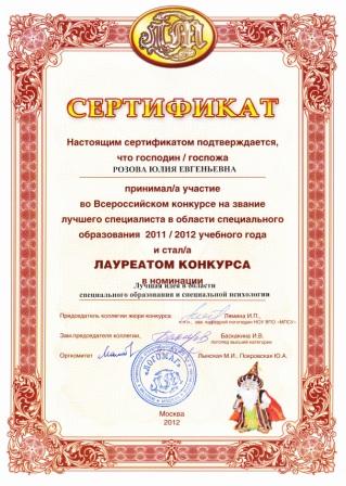 - Лауреат конкурса достижений в области образования «Поколение будущего» в номинации «Реализация инновационного проекта» - Проект « Нетрадиционные методы воздействия, здоровьесберегающие технологии в комплексной логопедической работе – перспективные средства коррекционно-развивающей работы с детьми с ЗПР» (2009г) - Дипломант IМеждународного конкурса «Школа высоких достижений» в номинации «Инновации педагогов в развитии творческих способностей детей младшего школьного возраста». Инновационный проект «Умники и умницы» - предметный конкурс среди учащихся начальных классов коррекционных (специальных) общеобразовательных школ» (2011г.) - Призер Международного конкурса "Активные методы обучения в образовательном процессе" (3-место, 2012 г.) -Лауреат Всероссийского конкурса на звание лучшего специалиста в области изучения и образования лиц с ограниченными возможностями здоровья 2011/2012 учебного года. Номинация «Лучшая идея в области специального образования и специальной психологии 2011-2012 учебного года», номинация "Лучший логопед". - Лауреат Всероссийского конкурса "Презентация к уроку", 2011-2012 уч.год. Перечень публикаций: 1)Т.В. Коробченко, Ю.Е. Розова. Здоровьесберегающие методы в работе с детьми с речевыми нарушениями» Сборник материалов научно-практических конференций «Реализация идей «Новой школы» в работе с детьми с речевыми нарушениями», «Учитель, перед именем твоим позволь смиренно преклонить колени…» ноябрь-февраль 2009-2010г., АППО:Санкт-Петербург, февраль 2010г. 2)Ю.Е. Розова, Коробченко Т.В., Смирнова В.П . Предметный конкурс «Умники и умницы» в коррекционной школе как одна из форм внедрения интеграционных инноваций в специальном образовании. Сборник материалов научно-практической конференции «Современные тенденции в системе образования лиц с ограниченными возможностями здоровья»,Санкт-Петербург,АППО, март 2011г. 3)Коробченко Т.В., Ю.Е. Розова, Здоровьесбережение – залог успешного коррекционно-развивающего обучения. Сборник материалов VIмеждународного конгресса валеологов: Санкт-Петербург, изд-во СПбГМУ, май 2011г. 4)Ю.Е. Розова, Коробченко Т.В. Использование мультимедийных презентаций для повышения эффективности логопедических занятий. Инновации в коррекции нарушений речи у детей и подростков. Сборник материалов научно-практической конференций с международным участием. -Санкт-Петербург, ЦДК проф. Л.Б. Баряевой, 2011г. -288с.(223-226) 5)Розова Ю.Е. Эффективность сочетания приемов сказкотерапии с инновационными и традиционными образовательными технологиями на логопедических занятиях//Инновации и традиции специального (дефектологического) образования - М.: Издательство «ЛОГОМАГ», 2012. 6)Розова Ю.Е., Коробченко Т.В. Роль светлой сенсорной комнаты в коррекции речевых нарушений у детей с ограниченными возможностями здоровья //Инновации и традиции специального (дефектологического) образования - М.: Издательство «ЛОГОМАГ», 2012. Самообразование