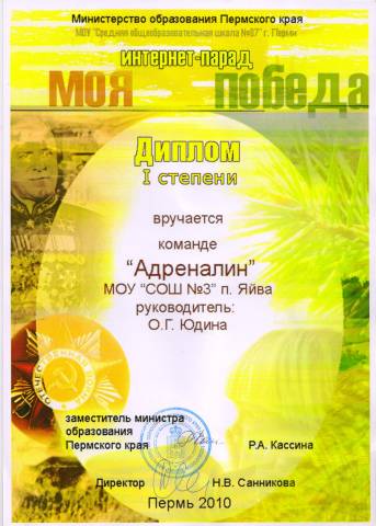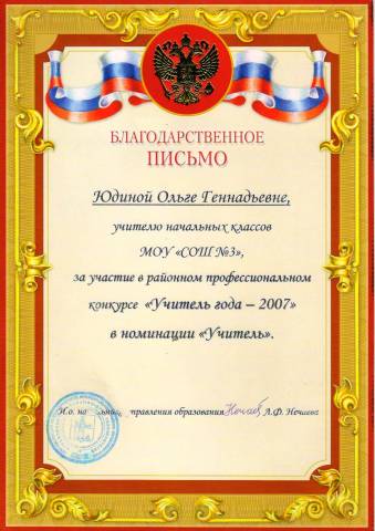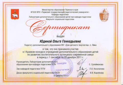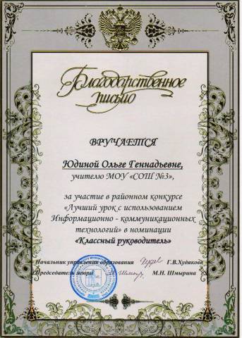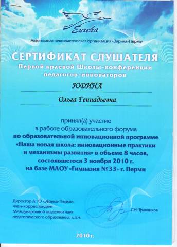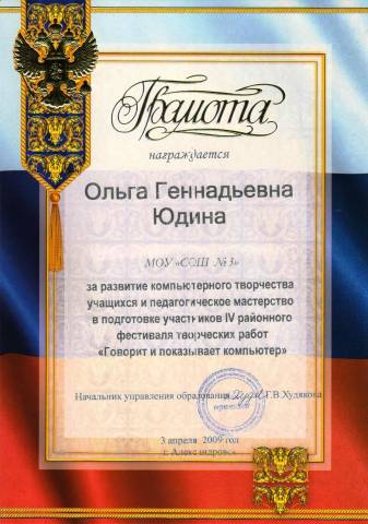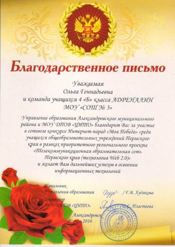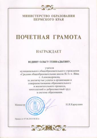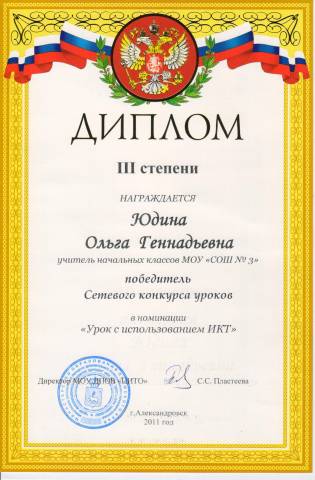 почётная грамота Министерства Образования Пермского края, благодарственное письмо за участие и победу (1 место в крае среди 111 школ) в сетевом конкурсе Интернет-парад "Моя Победа", диплом 3 степени в Сетевом конкурсе уроков на муниципальном уровне уровне "Урок с использованием ИКТ", грамота за развитие компьтерного творчества учащихся и педагогическое мастерство, сертификат участия в региональном конкурсе сценариев эколого-просветительского мероприятия "Урок чистоты", сертификат участия в 1 Краевом конкурсе по развитию потенциала современной семьи, диплом 2 степени в муниципальном конкурсе "Учительские династии" в рамках проекта ""Учитель, перед именем твоим", диплом за подготовку победителей Всероссийской дистанционной олимпиады по рускому языку для 1-4 кл., сертификат участия в муниципальном конкурсе-смотре методических и дидактических средств обучения, сертификат за выступление на Первой Краевой Школы-конференции педагогов инноваторов по образовательной программе "Наша новая школа: инновационные практики и механизмы развития", сертификат участника муниципальных Педагогических чтений "Компетентностный подход в образовании", сертификат участника конкурса "Лучший совместный урок - 2011" среди педагогов общеобразовательных учреждений Пермского края в рамках регионального проекта "Телекоммуникационная образовательная сеть Пермского края ("Технология Web 2.0"), сертификат участия в международной научно-практическом конференции "Педагогика памятных мест" совместно с немецкими коллегами.<br> Самообразование