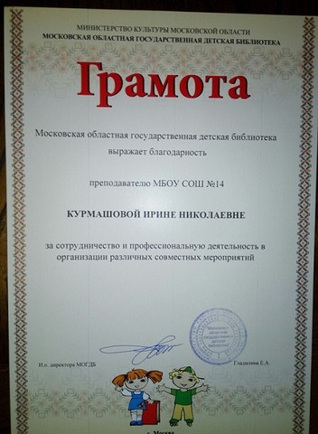 -"Московская областная государственная детская библиотека (ГБУК МО "МОГДБ") участие в громких чтениях " Акция: Читаем детям о войне" в рамках проекта "Мир памяти, мир сердца, мир души", 1-й класс: Жуков Кирилл (1 место), Глушак Рустам (2 место).