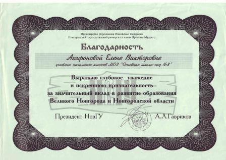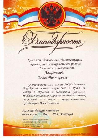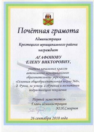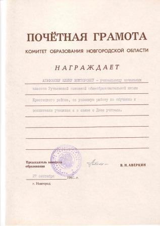 1.Почётная грамота. Комитет образования Новгородской области от 27.09.1995г.