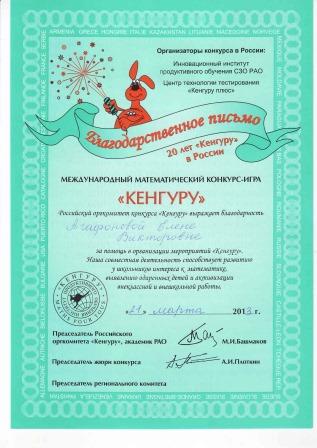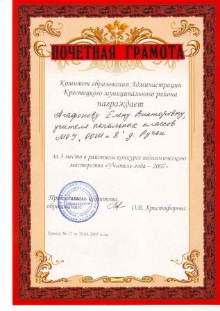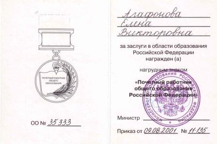 2. Почётный диплом лауреата конкурса "Учитель года 2001". Администрация Крестецкого района и отдел образования от 15.02.2001г. 3. Благодарность президента НовГУ имени Ярослава Мудрого А.л. Гаврикова. 4. Почётная грамота за 3 место в районном конкурсе педагогического мастерства "Учитель года - 2007". Комитет образования Администрации Крестецкого муниципального района от 20.04.2007г. 5. Благодарность Комитета образования администрации Крестецкого района от 28.09.2009г. 6. Почётная грамота Администрации Крестецкого муниципального района от 26.09.2010г. 7. Отраслевая награда министерства образования Российской Федерации. нагрудный знак "Почётный работник общего образования Российской Федерации", от 09.08.2001г. 8. Благодарственное письмо. Международный математический конкурс-игра "Кенгуру" от 21.03.2013г. 9. благодарность. Международный игровой конкурс по естествознанию "Человек и природа" от 18.04.2013г. 10. Сертификат о публикации авторских методических материалов на сайте Сообщество учителей - предметников "Учительский портал" №0551 от 30.04.2013г. Самообразование