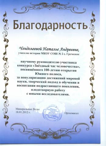 Являюсь автором-составителем двух программ факультативного курса по истории («Занимательная история» для 5 класса и «Власть и реформы» для 8 класса), получивших положительные рецензии на кафедре гуманитарных дисциплин СКИРО ПК и ПРО. Руковожу секцией «Персона» в ДОД ДДТ Малой Академии наук г. Минеральные Воды. Самообразование